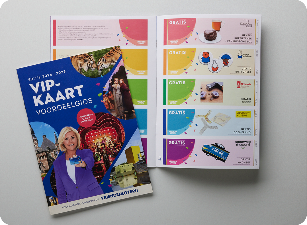 De 1,3 miljoen deelnemers van de VriendenLoterij kunnen van alles beleven met de persoonlijke VriendenLoterij VIP-KAART. Deelnemers krijgen gratis toegang tot meer dan 150 musea en korting op tickets voor onder andere bioscopen, theaters, dierenparken en kastelen. De VIP-KAART Voordeelgids, die alle deelnemers begin 2024 ontvangen, zit boordevol tips en inspiratie voor bijzondere uitjes. Bovendien bevat de gids exclusieve vouchers voor extra voordeel op eten en drinken en op mooie producten uit de museumwinkels.